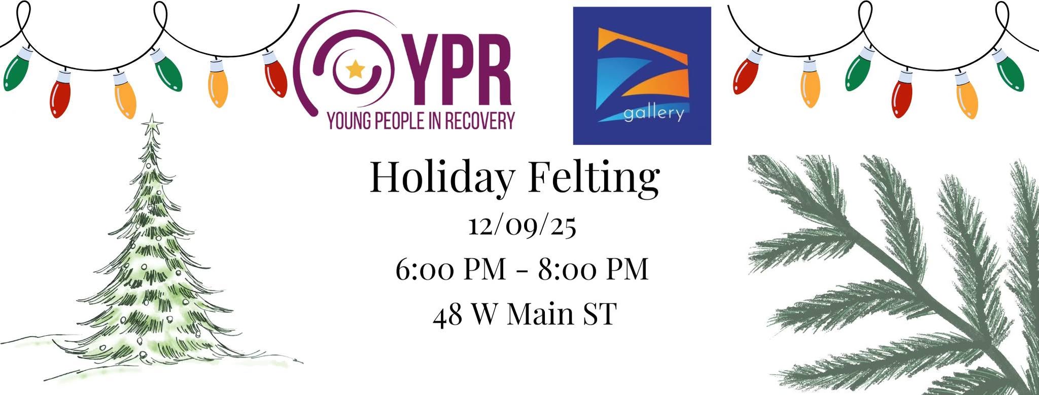 Pro-social events are designed as spaces that showcase we can and do have fun in recovery! Join us to felt anything Holiday related or a last minute gift From 6-8 PM at the Zu Gallery. Wool, instructions and tools provided! All levels of experienced or non experienced welcome!! If there is a need for anything please feel free to email cortezco@youngpeopleinrecovery.org
